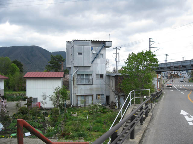 福島県南会津郡南会津町にある3階の建物。 3階にトイレがありすっとんを使用している。3階トイレのすっとん管(ボットン筒)は上部のほうで横に曲がっている。 例の物件は会津鉄道線の列車内からも見える。 |