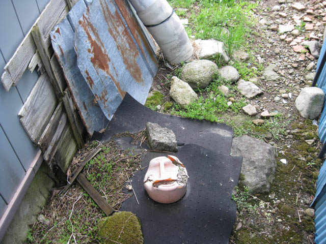 | すっとん管の付け根は土で、土の中に無臭トイレの便槽を埋めて使用している。 |