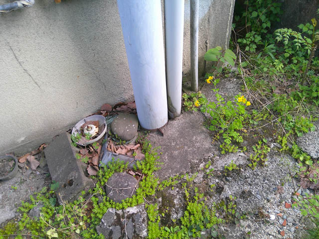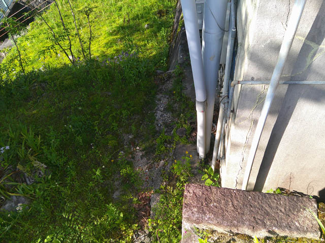 | 建物横から下を見ると、すっとん管がさらに下のほうに伸びている。 |
