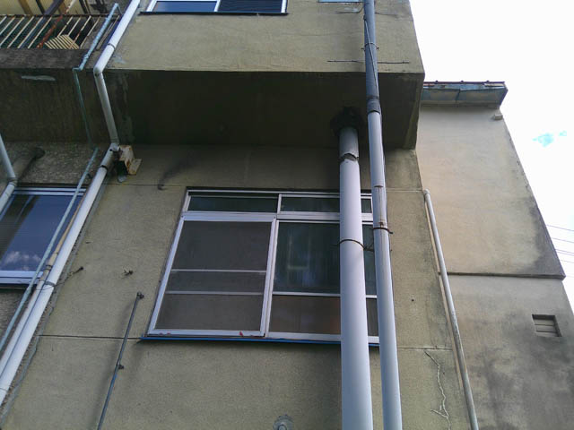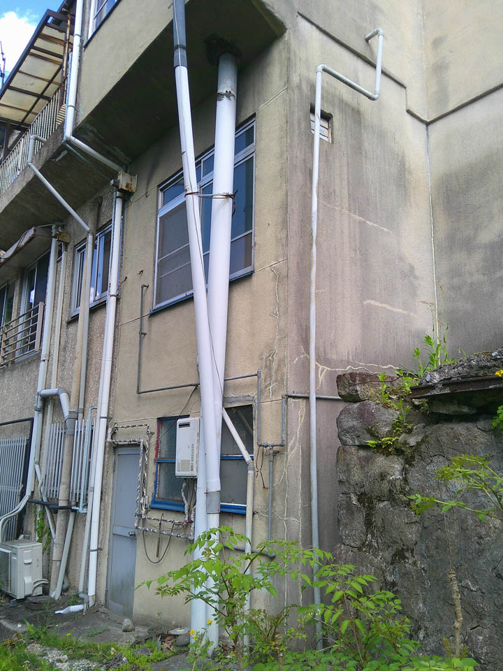 | 建物横から見ると3階トイレからのすっとん管が見える。 この位置でもかなり高い位置にある。 |