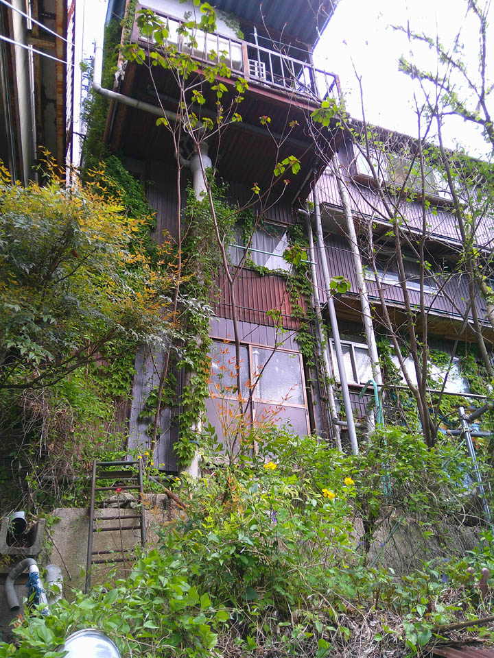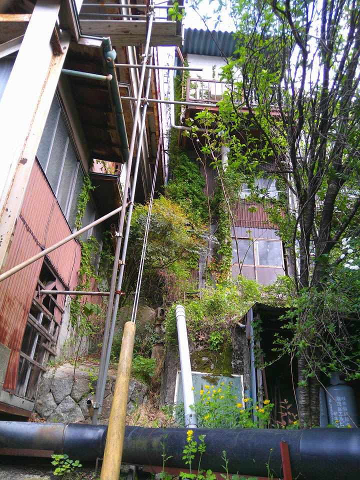| 崖際住宅兼喫茶店の裏側に3階トイレのすっとん管が見えている。 |