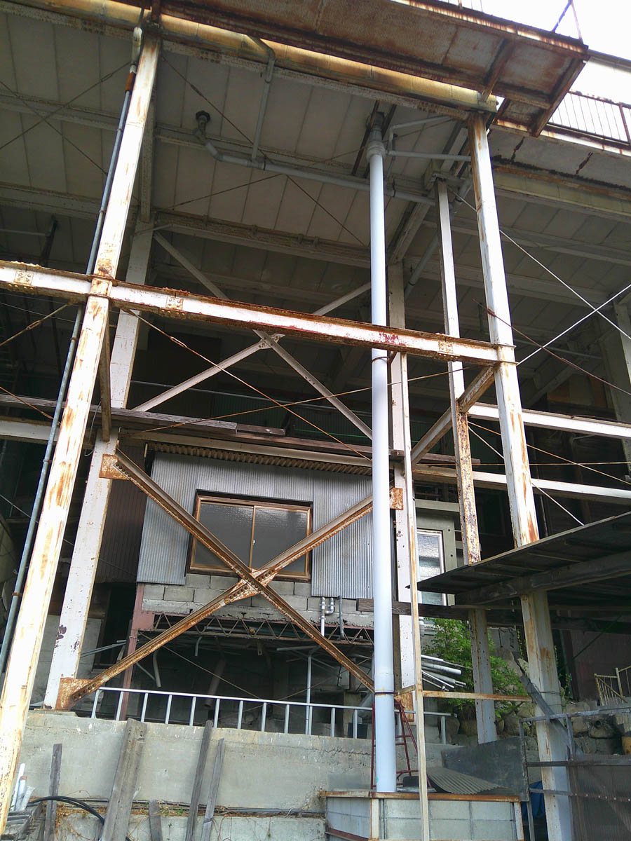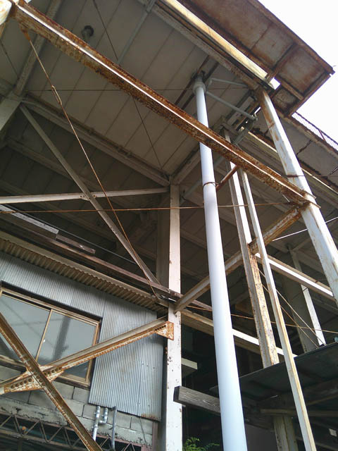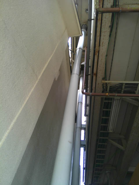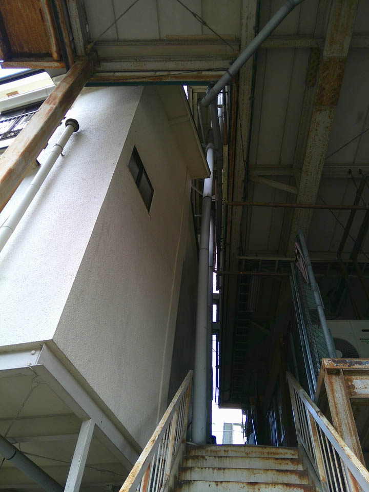 | 階段踊り場の通路脇に2階倉庫兼事務所用トイレのすっとん管2本が林立している。 |