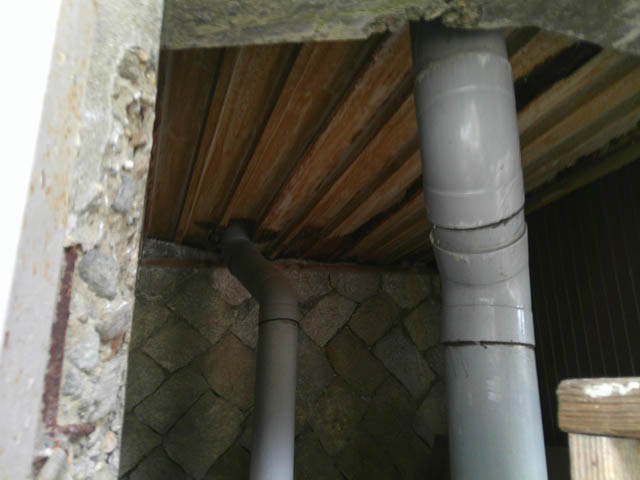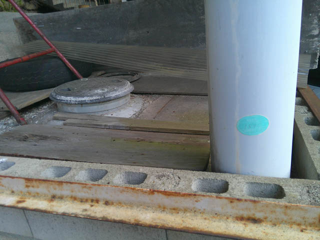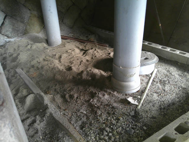 | 1階お客様用トイレのすっとん管の付け根。 すっとん管の付け根はブロック塀で積まれた中に敷き詰められた砂利で、砂利の中に無臭トイレの便槽を埋めて使用している。 |