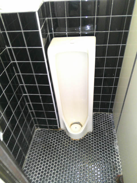 | 1階お客様用トイレの扉を入り正面側に小便器がある。 TOTO製のストール型小便器を非水洗用として使用。 |