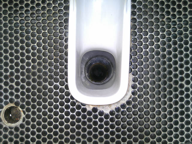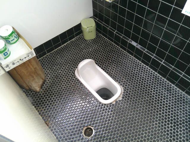 | 床設置型半穴式ボットンにスパッター装着。すっとん管の底は奈落の底のように深い。 汚れや臭いがなく、清掃がかなり行き届いている。 |