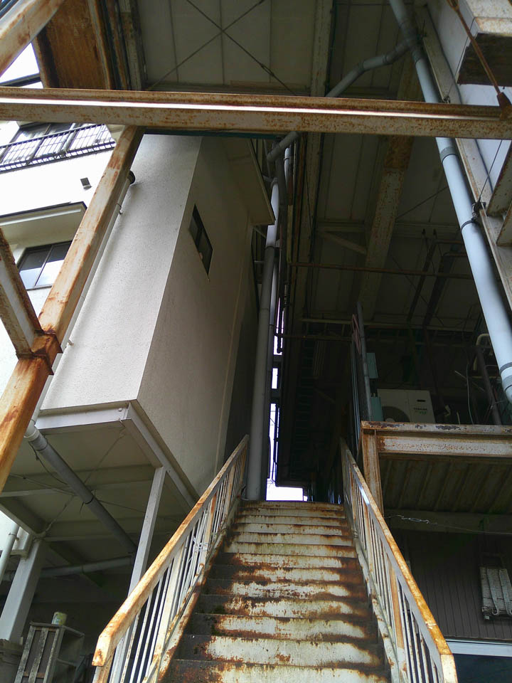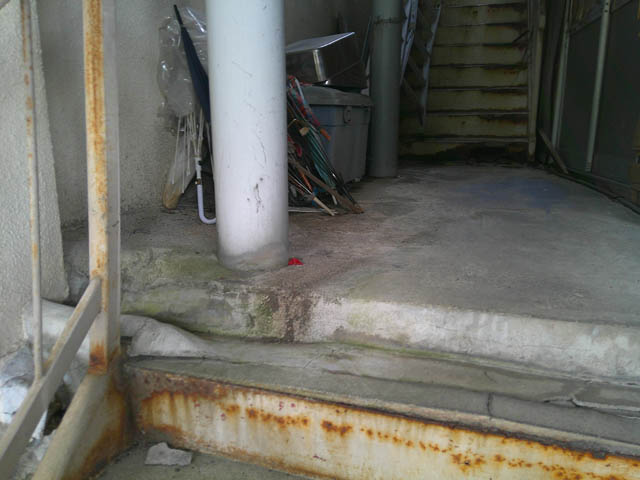 | こちらは1階店舗とお客様用駐車場を結ぶ階段通路。 通路脇に2階倉庫兼事務所用トイレのすっとん管がある。 |