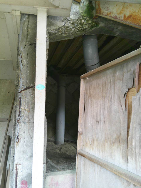 | 2階倉庫兼事務所用トイレのすっとん管の付け根は階段踊り場のコンクリート部分ではなく、さらにその下にある。 |