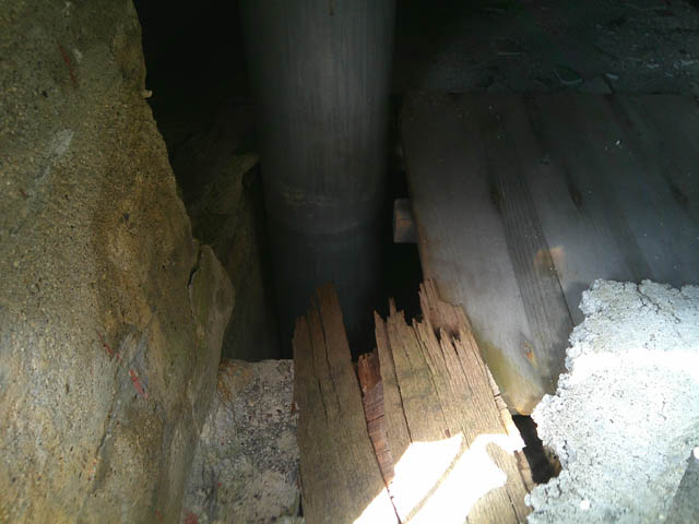 | ブロアーの横の穴の隙間から、すっとん式だった頃のすっとん管が残っていた。 穴の隙間は狭く、水洗式に変えた後もすっとん管を取り除くのは困難で、現在もそのまますっとん管が残っていたものと思われる。 |